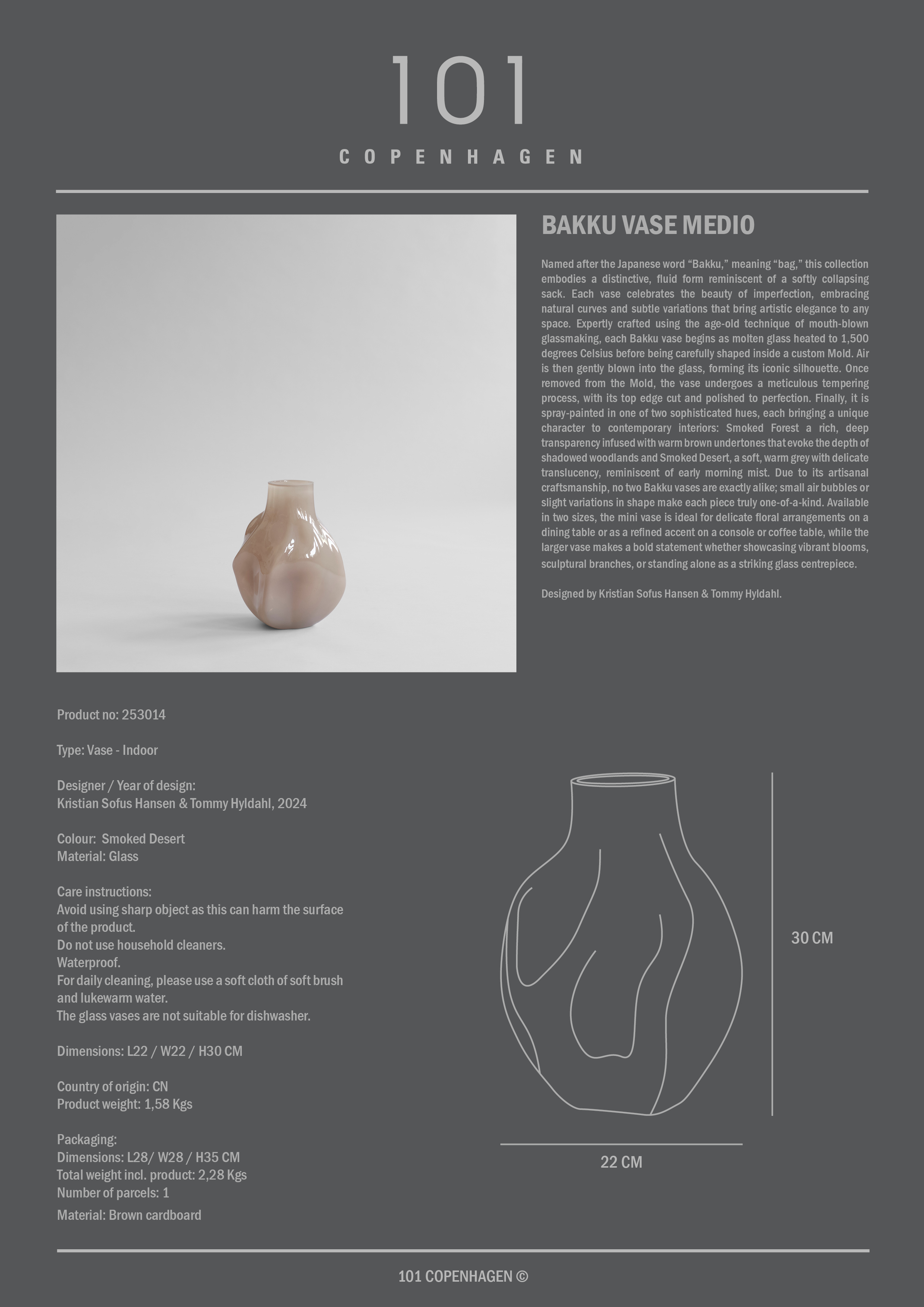 Bakku means bag in Japanese and has a soft organic shape, reminiscent of a collapsible sack. Each vase is mouth-blown glass formed in a custom-made mold, after which the edge is cut and polished. Finally, it is spray-painted in Smoked Forest with deep brownish tones or Smoked Desert in a light warm gray. As each vase is handmade, they vary in shape and may have small air bubbles, making each one unique. The series is available in two sizes, where the small is suitable for flowers on the table or as an elegant detail and the large one can stand alone or highlight branches and flowers as a striking centerpiece. Designed by Kristian Sofus Hansen and Tommy Hyldahl.