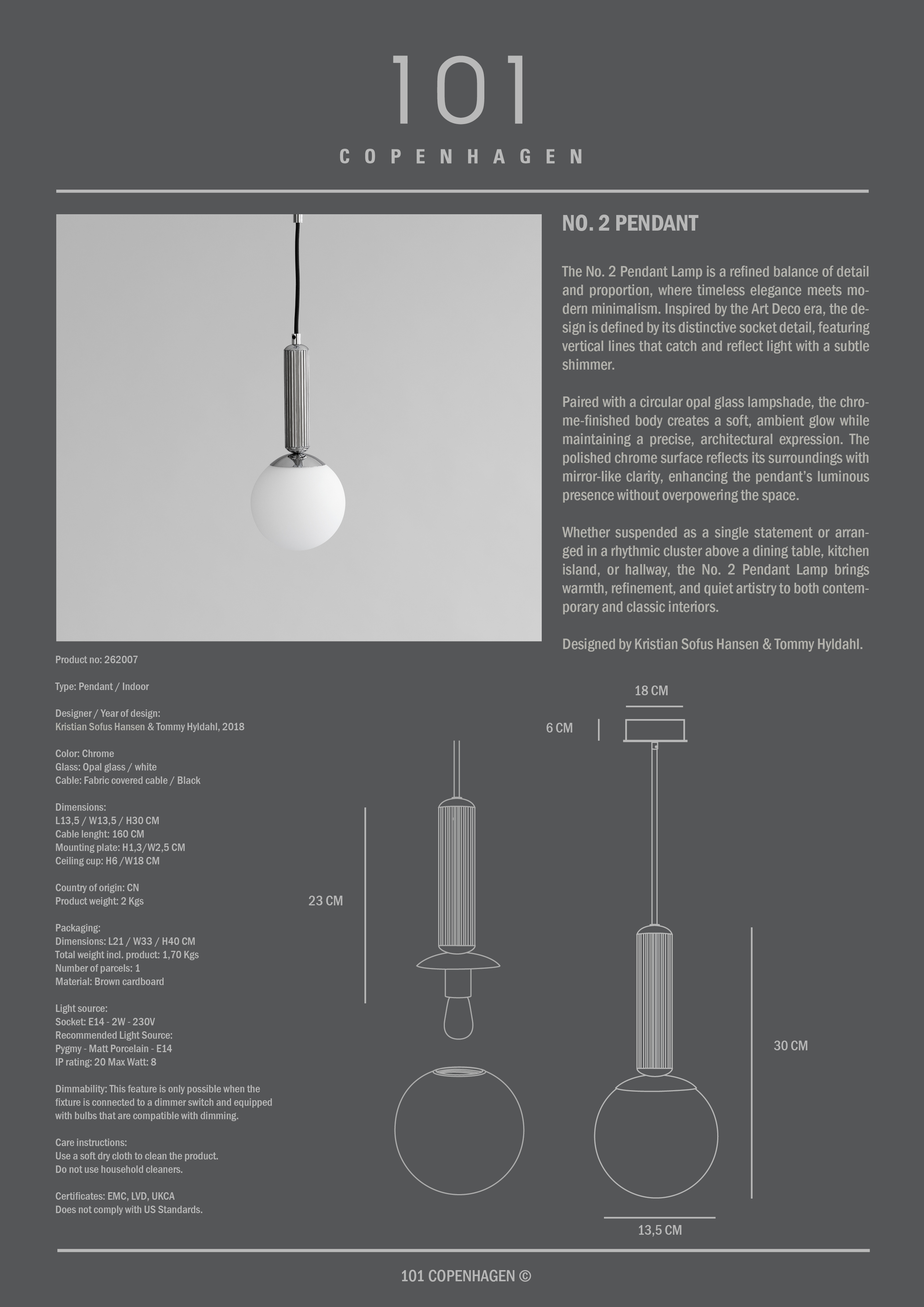 101 Copenhagen No. 2 Pendant Chrome £ 195 Live price match Ready for delivery in 30–40 days Add to basketExplore more product information No import fees - all duties pre-paid! (UK only) Free shipping on orders above 150 € Excluding large furniture and other selected products Authorised distributor